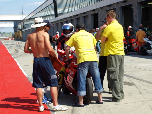 Mechanici mi nalili plnou a můj úkol zněl jasně - jezdit, dokud nádrž stačí, a to co nejrychleji, samozřejmě... Start z posledního místa a postupné prokousávání se startovním polem však využili soupeři na špici k tomu, aby nám uletěli. Přemek Glinz z BHR Racing Team Karviná nám dokonce nadělil kolo. Mým úkolem tedy bylo ztrátu na vedoucí jezdce minimalizovat. Po 30minutách strávených za řídítky jsem nadával, proč dělají ti japonci ty nádrže tak velké... Krizi jsem ale po několika kolech překonal a Romanovi jsem předával po 55minutách jízdy na 4. místě - ale hlavně se stejným počtem kol jako soupeři před námi!